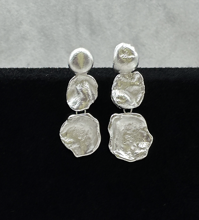To create the “Na Mara” earrings, liquid drops of Sterling Silver are poured into water (watercasting). This intricate dance of the elements results in organic and mostly unpredictable shapes. The technique was first explored by the artist while studying in Scotland, which inspired the name “Na Mara” — meaning “of the sea” in Gaelic. To enable as much of the water-like quality to be maintained, the individual elements have links that make them comfortable to wear and allow natural movement, catching the light from different angles.